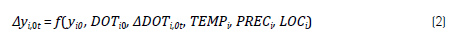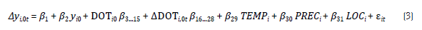 A seção anterior mostrou que o crescimento econômico, entre os períodos analisados (0 e t), de um município i qualquer [Δy i0t = ln(y it /y i0 )], depende de sua renda inicial (yi0), das dotações prévias de recursos (DOT i0 ), das alterações nessas dotações (ΔDOT m ), bem como de fatores invariantes no tempo, como a temperatura (TEMP i ), a precipitação (PREC i ) e a localização relativa (LOCi). Portanto: