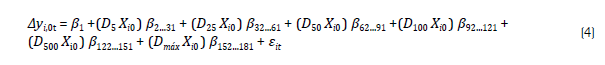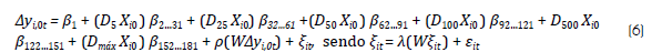 Sendo ß i ,, k , os coeficientes de impacto global associados às k variáveis explicativas e e it é um termo de erro aleatório. Logo, visando analisar os ß impactos, descritos na Equação 3, em locais com diferentes portes populacionais, inseriu-se termos interativos (Greene, 2002), que consistem na multiplicação das variáveis explicativas por dummies (binárias), referentes às 6 faixas populacionais da Tabela 1.5 Assim, incluindo todas as variáveis explicativas em uma matriz X i,0t , de dimensão ,=11010 por k =30 variáveis (exceto a constante), e criando 6 dummies de faixa populacional (i.e.: D5, D25, D50, D100, D 500 e Dmáx),6 o modelo para diferentes portes se torna: