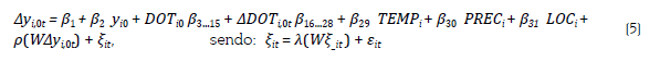 As equações 5 e 6 foram estimadas por Quasi Máxima-Verossimilhança (QMV), com base no método de efeitos fixos espacial (EFE), de Lee e Yu (2010), e no modelo de efeitos aleatórios espacial (EAE), proposto por Kapoor, Kelejian e Prucha (2007). Em ambos os casos, o efeito total de