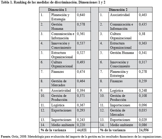 Los valores de las medidas de discriminación de cada factor gerencial, indican la importancia que estos tienen de la dimensión correspondiente, así, planeación y estrategia, gestión humana y comunicación e información son, en su orden, los tres factores más importantes en la dimensión 1, en tanto que en la 2 son: asociatividad, comunicación e información y cultura organizacional.