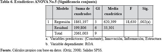 El mejor ajuste, según grados de significancia menores al 10%, se alcanza en el quinto modelo, teniendo como variables explicativas: estructura (0,015) e información (0,061), cuyos coeficientes señalan un buen comportamiento (menores al 7%). No obstante, el modelo 4 indica una especificación razonable, si estuviéramos dispuestos a enfrentar una probabilidad de equivocarnos en 36 de cada 100 veces que consideremos el factor gerencial de innovación y conocimiento, adicionalmente, la observación de significación conjunta de los tres parámetros (p-valor del contraste de la F) resulta altamente significativo a un 95% de confianza.