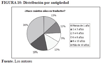 Según los datos, el 36% de los traductores en Colombia cuentan con más de 10 años de experiencia en la profesión, seguido de un 18% entre 8 y 10 años. Esta respuesta tiene sentido, ya que los primeros años de experiencia corresponden al tiempo en el que el traductor realiza parte de su pregrado, los siguientes corresponde al tiempo que usa durante la maestría o postgrado y, finalmente, el tiempo que continúen ejerciendo su labor. Este resultado se correlaciona con la edad ya que el 36% tiene entre 35 y 45 años de edad y con lo expuesto antes. Clavijo et al. (2006: 72) muestran que las empresas prefieren a los traductores con buena experiencia como un factor de selección.
