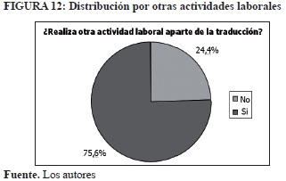 Si además sumamos los datos obtenidos en la respuesta 18 (un 75,6% realizan otra actividad: docentes, secretarios, músicos profesionales, estudiantes, ganaderos o vendedores), llegamos a la conclusión de que es necesario combinar la traducción con otro tipo de actividad profesional para poder alcanzar la carga laboral necesaria para subsistir o debido a oportunidades laborales o gustos en el ejercicio profesional. A continuación, se presentan tanto los datos de esta pregunta como los datos de la pregunta 18, ya que estas van de la mano.