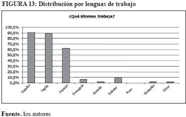 Como es de esperarse, el inglés es el idioma más traducido en Colombia (88,9%), seguido por el francés (62,2%). Los datos arrojados por esta pregunta son totalmente claros y lógicos, ya que son los idiomas que más se han acercado a Colombia, ya sea por la música, el comercio o la cultura en general. Esta encuesta concuerda en lenguas con la realizada por Zielinski, D. y Ramírez (2005), Clavijo et al. (2006: 73). Igualmente, los traductores en Colombia, traducen sólo hacia su lengua materna un 33,3% y un 66,7% hacen traducción directa e inversa.
