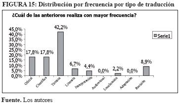 En esta respuesta, puede observar que el 93% de los encuestados son colombianos y el 6,7% de otras nacionalidades (Reino Unido, Holanda e Italia). Así, si tomamos en cuenta que los idiomas que más se traducen según la pregunta 14 son el inglés y el español, y que la traducción directa es la que más se realiza según la pregunta 15, podemos deducir que el traductor colombiano traduce generalmente del inglés a su lengua materna el español. A continuación, se presentan los diagramas de las respuestas 3 y 15.