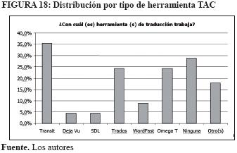 Los datos demuestran que la mayoría de los traductores en Colombia traducen con Transit (35,6%), seguida de Trados con un 24,4% y SDL 4,4% (de la misma casa) para un total de 32,4%. Igualmente, podemos observar que existe entre los traductores colombianos una variedad importante de herramientas TAC (Similis, MemoQ, Across, Bitrext, Oli-fant, Rainbow, entre otras). Según la encuesta tan sólo el 28,9% de los traductores no utilizan ninguna herramienta para traducir, porcentaje bastante similar al de los encuestados que no estudiaron una carrera profesional afín con lo idiomas (26,7%). Es totalmente posible que quienes no estudiaron carreras profesionales afines con los idiomas, nunca hayan tenido contacto o información sobre las herramientas utilizadas para traducir, por lo cual no las usan.