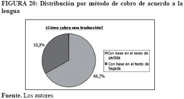 Esta es una pregunta polémica y tabú dentro de la profesión en Colombia y son las asociaciones las que tienen una idea más clara del asunto. Los profesionales europeos cobran con base en el texto de partida y los programas TAC así lo hacen para entregar las estadísticas al usuario. Sin embargo, muchos traductores en Colombia insisten en cobrar con base en el texto de llegada. Según los datos, la mayoría de los traductores en Colombia cobra con base en el texto de partida, siguiendo con los criterios europeos (66,7%). Aún así, el porcentaje es bajo de acuerdo con los parámetros internacionales. En este sentido la NTC 5808 (14), recomienda cobrar con base en la lengua de partida y hace recomendaciones en este aspecto.