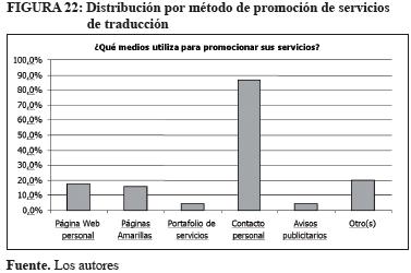 Debido a la falta de asociaciones, sociedades y agrupaciones, los traductores en Colombia en su mayoría promocionan sus servicios por medio de contactos personales (86,7%). Este resultado es la consecuencia de una cantidad de factores económicos, sociales y culturales que existen en Colombia respecto a la traducción, entre ellos, todos los mencionados en las preguntas anteriores. Igualmente, puede decirse que los traductores no suelen promocionar sus servicios adecuadamente mediante el uso de las nuevas tecnologías. Incluso, los métodos tradicionales como avisos y páginas amarillas no son bien utilizados (un 4,4% y 15,6%, respectivamente).