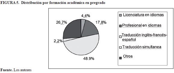 Este es una de los resultados más alentadores. Más de la mitad de los traductores ha estudiado traducción e interpretación (48,9% y 2,2%). El resto de encuestados estudió carreras afines a las lenguas (licenciatura en lenguas modernas, filología y lenguas y secretariado bilingüe) y un porcentaje relativamente bajo se alejó totalmente del tema medicina, ingeniería ambiental, artes y periodismo. Solo una persona respondió que no ha realizado ningún estudio de pregrado.