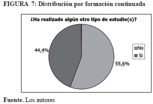 La mayoría de los traductores en Colombia han realizado estudios de pregrado y de postgrado, pero no han realizado estudios adicionales (55,6 %). Sin embargo, los porcentajes están muy parejos y, por su parte, la minoría si ha realizado cursos y seminarios ya sea sobre traducción, música, incendios, etc. (44,4 %).Estos cursos adicionales son importantes porque los traductores deben tener una cultura general muy amplia y si es posible, especializarse en un tema específico. En este sentido, Clavijo et al. (2006: 73) muestran que las empresas colombianas prefieren a un traductor idóneo para realizar sus traducciones.