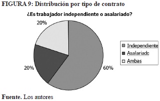 Puesto que, en Colombia, la traducción como profesión es una profesión en desarrollo, la existencia de agencias y empresas de traducción de pequeño tamaño que contraten traductores es casi nula. Por lo anterior, los resultados de esta pregunta son obvios: la mayoría de los traductores en Colombia son independientes (60%) y siguen la tendencia de muchos países como Dinamarca en donde más del 50% son traductores independientes (Dam y Zethsen 2010: 194) y en Colombia las empresas emplean más a traductores de este tipo que a agencias (Clavijo 2006: 73).