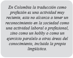 Ya que en Colombia la traducción como profesión es una actividad muy reciente, esta no alcanza a tener un reconocimiento en la sociedad como una actividad laboral o profesional, sino como un hobby o como un ejercicio paralelo a otras áreas del conocimiento, incluida la propia lingüística.