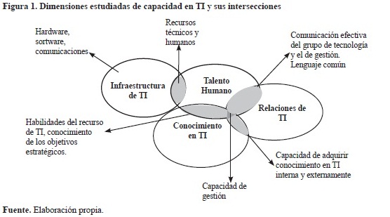 En la revisión de literatura, las dimensiones expuestas se traslapan. En algunos casos la dimensión de infraestructura de TI incluye el talento humano relacionado con TI identificando separadamente la dimensión de conocimiento de TI (Crawford et al., 2011; Young, 2011). En otros estudios se plantea dentro de la dimensión de recurso humano las habilidades, conocimiento y experiencia del personal en relación con la tecnología y su habilidad para integrar el conocimiento con las estrategias del negocio (M. Zhang, Sarker y McCullough, 2008). Las capacidades de gestión de TI pueden incluir tanto la experiencia como las relaciones entre negocio y gerencia de tecnología (Bhatt y Grover, 2005), traslapándose así el recurso humano, el conocimiento y las relaciones de TI. En la figura 1 se muestran las intersecciones entre las dimensiones expuestas.