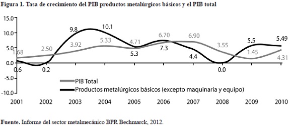 En el periodo comprendido entre el 2002 y 2009, el sector metalmecánico ocupó aproximadamente a 350.000 personas y generó ventas anuales cercanas a los 24,5 billones de pesos, lo que lo llevó ha convertirse en un impulsor de la economía de la pasada década. Como se observa en la figura 1, este sector en los dos últimos años, ha mostrado un mayor crecimiento del PIB que el PIB total (EAM, 2012).