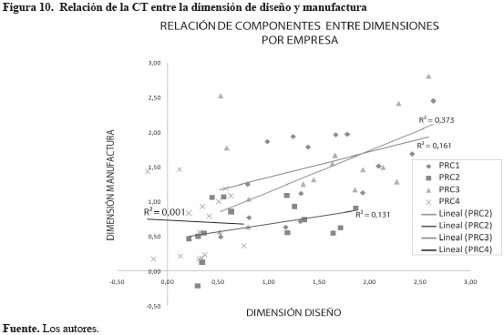 Como se observa en la figura 9, existen falencias de capacidad tecnológica de las empresas frente a una empresa ideal13; otro elemento evidenciado en la Matriz de Capacidad Tecnológica, es el bajo nivel de desarrollo, por lo tanto el reto de las empresas es aumentar su nivel en las dos dimensiones: diseño y manufactura de forma independiente y armonizada, ya que como se observa en la figura 10 no existe grado significativo de dependencia lineal entre las dos dimensiones14.