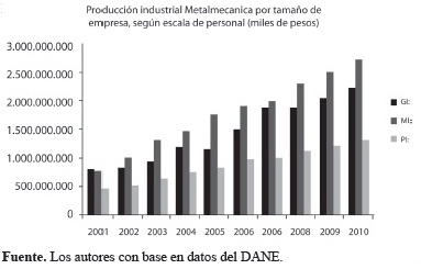 Para el desarrollo del estudio se seleccionó el grupo de empresas pequeñas y medianas del sector, la razón para ello es que las micro empresas abundan en la informalidad y para este sector las grandes empresas no son las que más aportan a la producción industrial, como se muestra en la figura 5, en donde se observa el crecimiento sostenido de los tipos de empresas seleccionado.