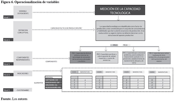 Para la evaluación de estos cuatrocuatro aspectos se realizó una adaptación a las particularidades de las Pymes metalmecánicas colombianas, según las características de la tipología M3 y se plasmó en una herramienta de evaluación compuesta de tres secciones: características generales de la empresa, dimensión de diseño y dimensión de manufactura. Esta herramienta está estructurada en cinco5 niveles, cado uno de ellos pretende enfocarse en las áreas centrales de este sector. En la figura 6 se muestran los elementos de cada nivel que parte del concepto de capacidad tecnología y genera los indicadores convertidos en 57 ítems en escala Likert.