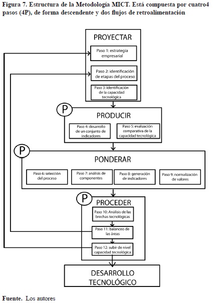 Para el desarrollo de la investigación se propone la metodología de integración de capacidad tecnológica MICT, con 12 pasos agrupados en cuatro fases ([4P]); proyectar, producir, ponderar y proceder, como se muestra en la figura 7.