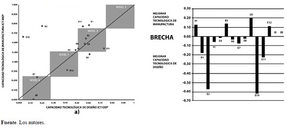 Paso 11. Balanceo de las áreas. Dependiendo del valor de la brecha tecnológica se pueden presentar dos situaciones para disminuir la brecha tecnológica de las empresas; brechas positivas y brechas negativas. Las brechas positivas requieren mejorar las actividades de la capacidad tecnológica de manufactura y las negativas mejorar las actividades de la capacidad tecnológica de diseño. Para ello es necesario revisar los indicadores de los componentes de la capacidad para cada empresa y proponer estrategias de gestión tecnológica.