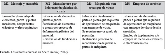 La clasificación por tamaño de empresa se centra en los aspectos económicos y de capacidad de uso de mano de obra, sin embargo, para la generación de estrategias sobre la capacidad tecnológica CT, es necesario realizar una taxonomía más acorde con las características del sector, e involucrar los procesos y componentes tecnológicos. Entre los trabajos consultados como la caracterización de la mesa metalmecánica del SENA (2002), el estudio de la Universidad Nacional y el SENA (Mesa Sectorial de Diseño), la Alcaldía de Bogotá (Acero, 2002), y del DNP sobre el sector (Cámara de Comercio de Bogotá., 2006), se establecen algunos parámetros tecnológicos en común pero se observa que la relación Diseño - Producto - Proceso es fundamental para aplicar cualquier tipo de intervención relacionado con la capacidad tecnológica. Con el fin de describir los factores involucrados en el proceso productivo sobre las dimensiones (diseño - manufactura) y establecer estrategias que relacionen la estructura tecnológica, se presenta a continuación modelos de empresas del sector y sus parámetros5 (Acero, 2002).