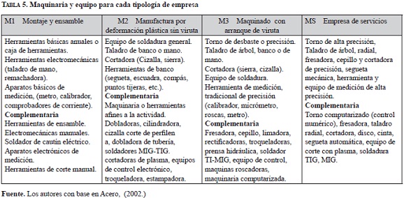 Maquinaria y herramienta básica. Las máquinas y herramientas son elementos sensibles al cambio tecnológico y la gestión que se hace sobre ellos debe hacer parte de la estrategia de la empresa. La tabla 5, hace un compendio de la maquinaria y equipo típico de cada una de los modelos de empresa.