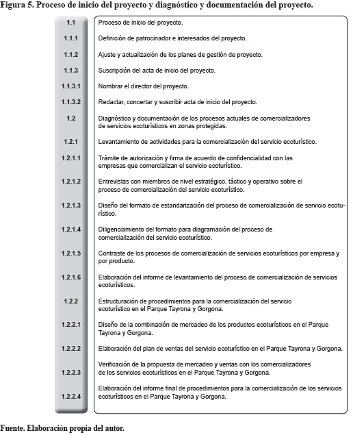 Para realizar este proceso, se creó la estructura de desglose del trabajo hasta cuatro niveles como mínimo. La siguiente, es la estructura de la división del trabajo para el proyecto de Métodos y Herramientas, para la prestación del servicio ecoturístico en zonas de Alto Valor Ecológico y Cultural (AVEC). El proyecto se estructuró en cinco fases o divisiones como se puede apreciar en la figura 4.