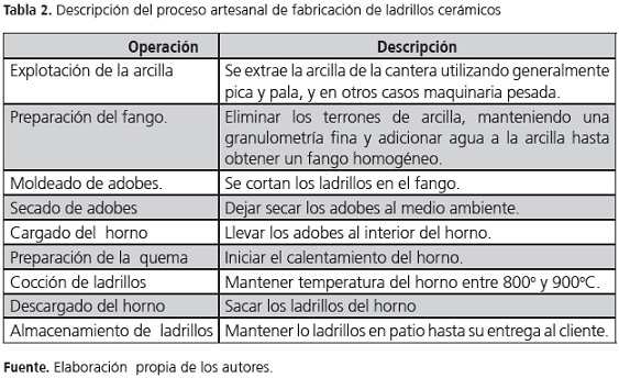 Actualmente, el proceso de fabricación del ladrillo (industria de mampostería) en el departamento de Boyacá, es una actividad artesanal que se realiza siguiendo un método de trabajo con los siguientes pasos: explotación de la arcilla, preparación del fango, moldeado de los adobes (ladrillos sin cocción), secado de los adobes y cocción de los ladrillos. Estas actividades se han venido desarrollando por parte de unidades familiares que han transferido el conocimiento del proceso, de generación en generación, utilizando instalaciones artesanales que utilizan leña y carbón como combustible, denominados chircales.