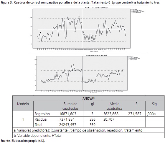 Se aplican cuadros de control en el crecimiento de la planta dando los siguientes resultados que muestran los comparativos del grupo control frente al tratamiento tres, en la variable altura de la planta (Figura 3).