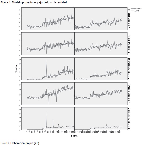 - El Modelo, comparado con la realidad, representa el valor medio de las variables dependientes y cumple la función de proyección en diferentes estadios de tiempo y crecimiento en las plántulas de café.