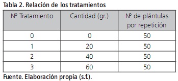 El diseño experimental corresponde a bloques completos al azar con tres repeticiones por tratamiento. Con la siguiente asignación de micorrizas por tratamiento: T0=0 g, (grupo control), T1=20 g, T2= 40 g y T3 = 60 g (Tabla 1); el modelo fue aplicado a plántulas de cafeto (Coffea arabica) con aplicaciones en diferentes cantidades de inóculo de hongos micorrícico arbusculares. La relación p177 de los tratamientos se observa más adelante (Tabla 2).