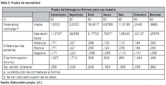 Se realiza la prueba de normalidad K-S, para determinar el tipo de frecuencia en que se comportan las variables (Tabla 3).