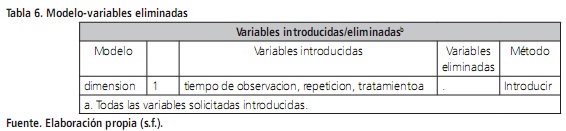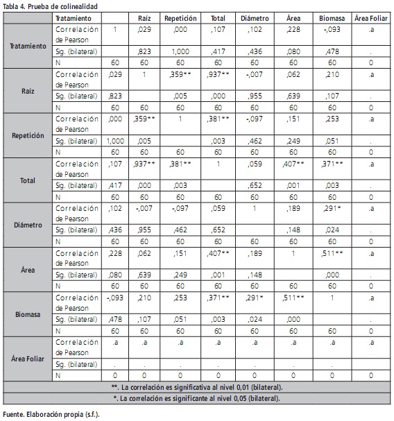 Así mismo, se aplicó una prueba de colinealidad para determinar la correlación entre variables, la cual permite delimitar la relación entre las variables independientes y las variables de estudio. Para este caso la prueba de colinealidad permitió descartar variables sustituibles o que ejercen la misma función afectando el análisis explicativo del experimento (Tabla 4).