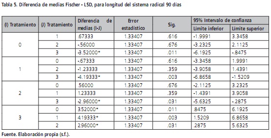 A continuación, por medio de la prueba de diferencia de medias LSD de Fisher, se determina la diferencia entre las medias de los diferentes tratamientos, lo cual permite demostrar que el tratamiento tres, mejora los rendimientos en 90 días frente a las otras opciones de tratamiento (Tabla 5).