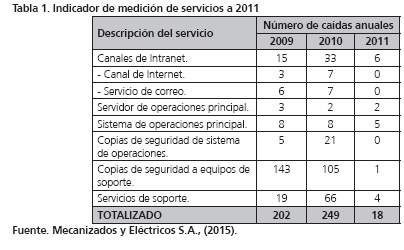 A partir del año 2009 se comenzaron a documentar los incidentes que afectaban el normal funcionamiento de la infraestructura tecnológica en Mecanizados y Eléctricos S.A. y que provocaban caídas o afectación de los principales servicios de la organización. Con los datos recolectados se estableció el indicador «Medición de servicios» (Tabla 1).