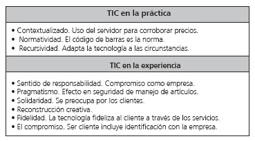Diferencias. Se percibe diferencia entre TIC en la parte práctica -normatividad- con relación a las TIC, como experiencia -compromiso, lealtad, sentido-, cuyo énfasis va hacia el cliente como individuo.