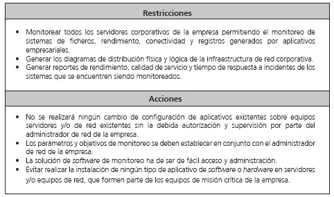 Con el fin de determinar que la implementación sea satisfactoria, diversas necesidades y restricciones se han establecido para cumplir el sistema de monitoreo en la organización, donde este será llevado a cabo. Los lineamientos establecidos por la empresa son los siguientes: