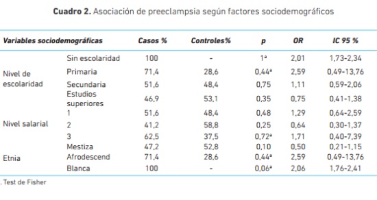 En el análisis bivariado, inicialmente se cruzaron las variables sociodemográficas con la preeclampsia (cuadro 2). Se omitieron las variables de edad, índice de masa corporal al principio del embarazo y antecedentes gineco-obstétricos, ya que estaban controladas mediante apareamiento.