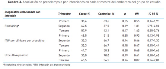 Se pudo observar que la preeclampsia parece no guardar asociación con la rinofaringitis, la infección del tracto urinario diagnosticada por clínica o urocultivo ni con urocultivo positivo, diferente a lo encontrado por Conde-Agudelo et al., en su metaanálisis (10)quienes reportan asociación de infección del tracto urinario y preeclampsia (OR= 1,57; IC 95 %= 1,4-1,7). Encontramos una asociación significativa, en aquellas pacientes a quienes no se les realizó urocultivo en el tercer trimestre. Sin embargo, debe considerarse esta asociación como espuria por su no coherencia con la realidad clínica.
