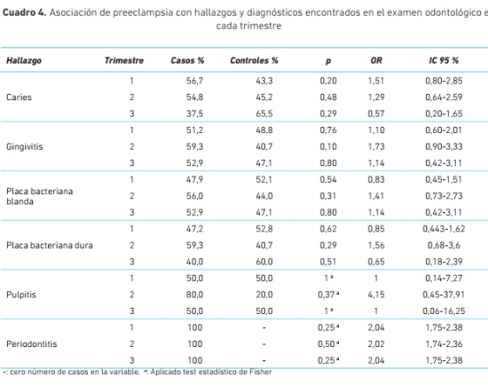 Puede entonces considerarse que la caries en el primer trimestre, junto con la presentación de otros hallazgos dentales y de infecciones urinarias puede estar asociada con preeclampsia. Poca evidencia hay en la literatura al respecto: un estudio realizado por Khader et al. con 115 mujeres con preeclampsia y 230 controles también encuentra dicha asociación, OR 1,15 (IC 95 %= 1,05-1,25) en el análisis bivariado y OR 1,14 (IC 95 %= 1,03-1,27) en el análisis multivariado, en el que se incluyeron factores asociados como la edad, nuliparidad y el índice de masa corporal al principio del embarazo(19).