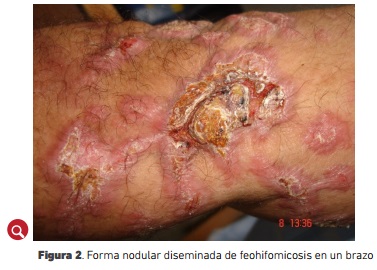 Los síndromes clínicos causados por hongos dematiáceos incluyen otras entidades como la cromoblastomicosis y el eumicetoma, que se diferencian en la clínica y laboratorio. La cromoblastomicosis se caracteriza por la presencia de cuerpos escleróticos o fumagoides en los tejidos, el eumicetoma por la presencia de gránulos micóticos y el compromiso usual de miembros inferiores (3,4). Teniendo en cuenta lo anterior, el término feohifomicosis puede ser muy extenso y ambiguo, y sólo debe reservase para los síndromes clínicos diferentes a cromoblastomicosis y eumicetoma (2,7).