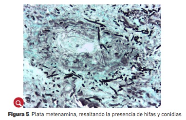 Se dice que no necesitan tinciones especiales porque tienen su propio pigmento café, pero pueden resaltar con plata metenamina (figura 5) y ácido peryódico de Schiff (PAS) (2,12). El uso de coloración de Fontana-Masson tiñe fuertemente la melanina y ayuda a hacer diagnósticos diferenciales con otros hongos filamentosos (12,32), o con Aspergillussumando la detección de galactomanan (33).
