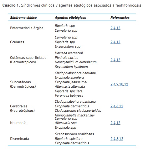 Las feohifomicosis constituyen un grupo raro de infecciones con incremento reconocido y asociado a una variedad de síndromes clínicos. Es importante conocer estas micosis emergentes para considerarlas clínicamente; así mismo, en el laboratorio la identificación oportuna del hongo y la susceptibilidad a antimicóticos in vitro, son demandados para lograr mejor respuesta al tratamiento.