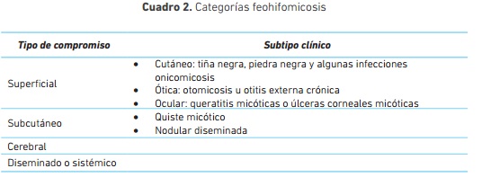 En 1988 Fader et al., clasifican las infecciones causadas por hongos dematiáceos en tres categorías: cromoblastomicosis, feohifomicosis y micetoma (20). Actualmente no existe un consenso, pero una forma sencilla y práctica es la recomendada por Bonifaz (2), el cual la clasifica en cuatro categorías: superficial, subcutánea, cerebral y diseminada o sistémica (cuadro 2) (2).