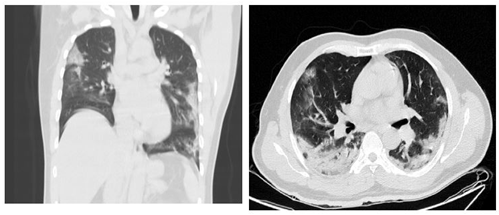 Figura 1A y 1B. Imágenes del TACAR con Infiltrados subpleurales bilaterales en bases y lóbulos medio, con patrón “Crazy Paving” de cuatro cuadrantes del parénquima pulmonar. Hallazgos sugestivos de infección por COVID-19.
