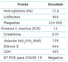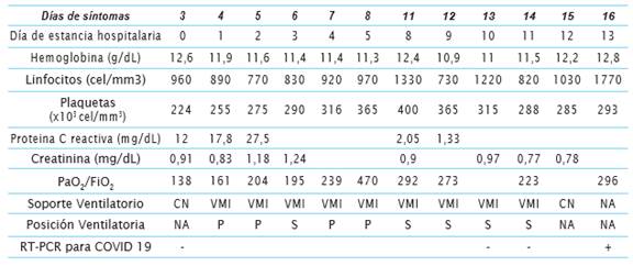 Con el resultado negativo de la RT-PCR tomada al tercer día de síntomas, en contexto de alta sospecha clínica y según algoritmo diagnóstico de las guías de práctica clínica vigentes, se hace monitoreo clínico y paraclínico (cuadro 2). Se realizan pruebas de RT-PCR seriadas en aspirado traqueal (díaS 13 y 14 desde el inicio de los síntomas), resultando nuevamente negativas.