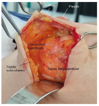 El seno es una glándula sudorípara modificada que produce secreción láctea en el periodo posparto, producida en múltiples acinos que drenan dentro de un lóbulo y convergen a través del tejido mamario mediante 15 a 20 conductos lactíferos principales que se unen y se abren en el ápice del pezón, tiene una dilatación leve que forma una ampolla que permite ayudar en el almacenamiento y eyección de leche13 (foto 1).