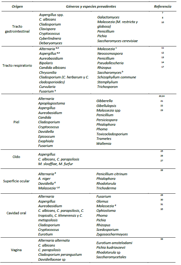 En comparación con el microbioma, el estudio del micobioma es incipiente, en especial las comunidades fúngicas en individuos sanos. Esta revisión tiene como objetivo recopilar los estudios que se han realizado sobre las comunidades fúngicas en humanos sanos, las diferencias de diversidad y densidad en comparación con individuos enfermos y hacer la distinción entre los grupos y especies de hongos propios de cada zona del cuerpo. En el cuadro 1 se resumen los géneros y especies de hongos reportados como parte del micobioma en los seres humanos.
