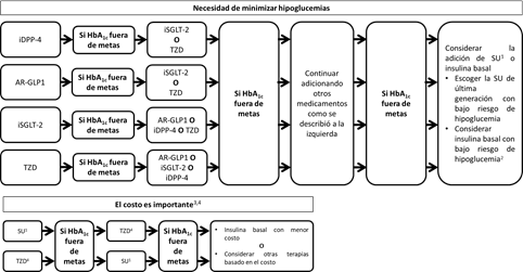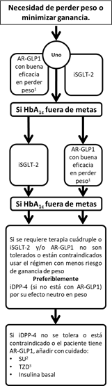 Se debe evaluar el control glucémico a los 3 meses de haber iniciado la terapia. En caso de que no se haya logrado la meta de HbA1c, la intensificación debe continuar usando AR-GLP1 sí inicialmente se eligió el iSGLT-2, o el iSGLT-2 de haberse usado en primera instancia un AR-GLP1. Es necesario tener presente que si se está usando AR-GLP1 no debe usarse de forma concomitante los inhibidores de la dipeptidil peptidasa 4 (iDPP-4).