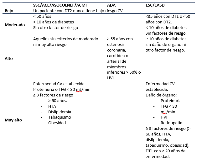 Una vez reconocido el riesgo de enfermedad cardiovascular en los pacientes con DT2 es necesario preguntarse si el paciente al cual se está enfrentando tiene riesgo cardiovascular alto o muy alto pues esto modificará la conducta. Múltiples sociedades científicas (3, 6, 7) han definido este riesgo de diferentes maneras; los autores recomiendan para población colombiana, definirlo con base a las recomendaciones de la Sociedad Colombiana de Cardiología y Cirugía Cardiovascular (SCC), la Asociación Colombiana de Endocrinología (ACE), la Asociación Colombiana de Nefrología (ASOCOLNEF) y la Asociación Colombiana de Medicina Interna (ACMI) del año 2020 7 (Tabla 1).