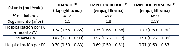Se cuenta con 2 ensayos clínicos realizados en población con falla cardíaca con fracción de eyección reducida (FEVI <40%) con y sin diabetes, el DAPA HF 30 realizado con dapagliflozina y el EMPEROR-REDUCE 31 con empagliflozina. Estos dos medicamentos disminuyeron el desenlace primario compuesto por muerte de causa cardiovascular y hospitalización por falla cardíaca en un 26% para dapagliflozina y en un 25% para empagliflozina (Tabla 3). Si bien aún no se cuenta con estudios en población exclusiva de falla cardíaca para canagliflozina y ertugliflozina, como podemos evidenciar en la Tabla 2 y en múltiples metaanálisis, 9,32) el efecto de los iSGLT-2 sobre el desenlace de hospitalización por falla cardíaca es un efecto de clase.